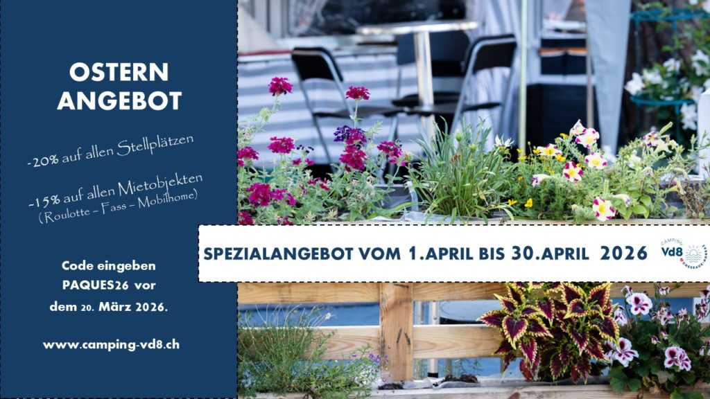 Spezialangebot vom 1. April bis 30. April 2026!-20% auf allen Stellplätzen-15% auf allen Mietobjekten (Roulotte - Fass - Mobilhome)Code eingeben : "PAQUES26" vor dem 20. März 2026